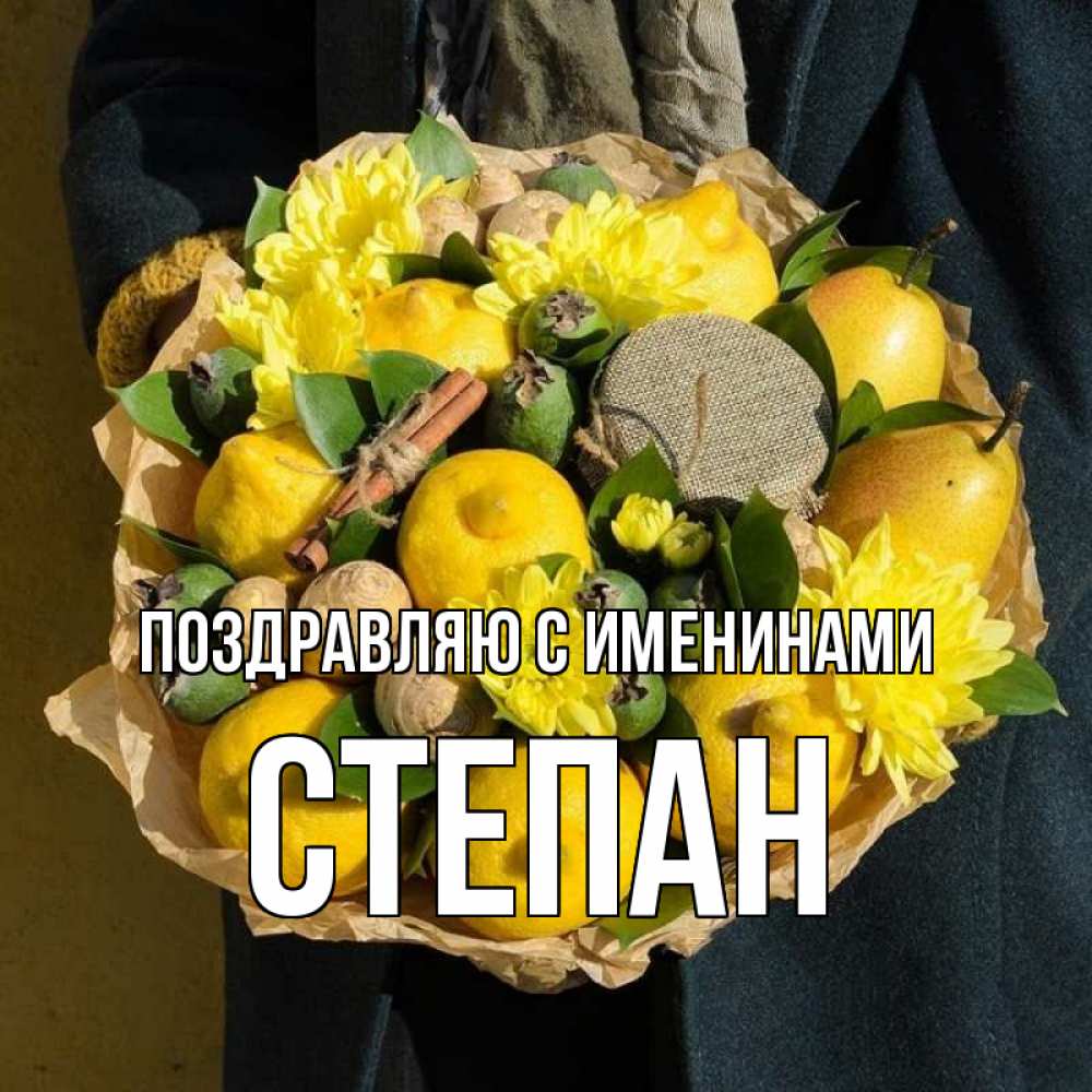 Открытка Поздравляю с именинами Степан. желтые цветы и лимоны. букет витаминов