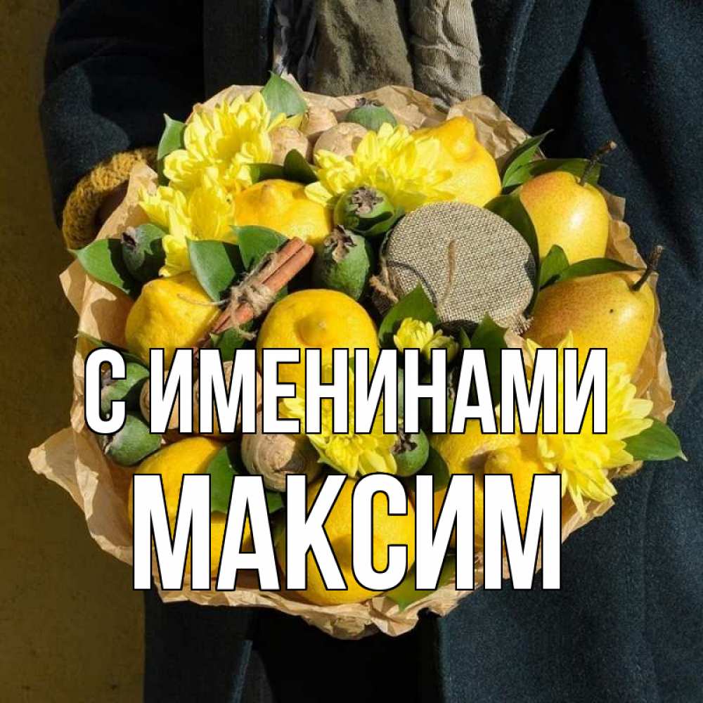 Открытка С именинами Максим. желтые цветы и лимоны. букет витаминов