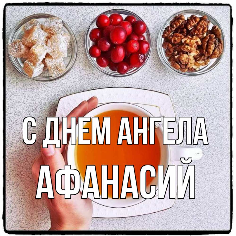 Открытка С днем Ангела Афанасий. много полезных вкусняшек. на столе