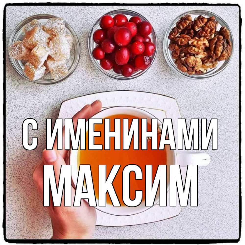 Открытка С именинами Максим. много полезных вкусняшек. на столе