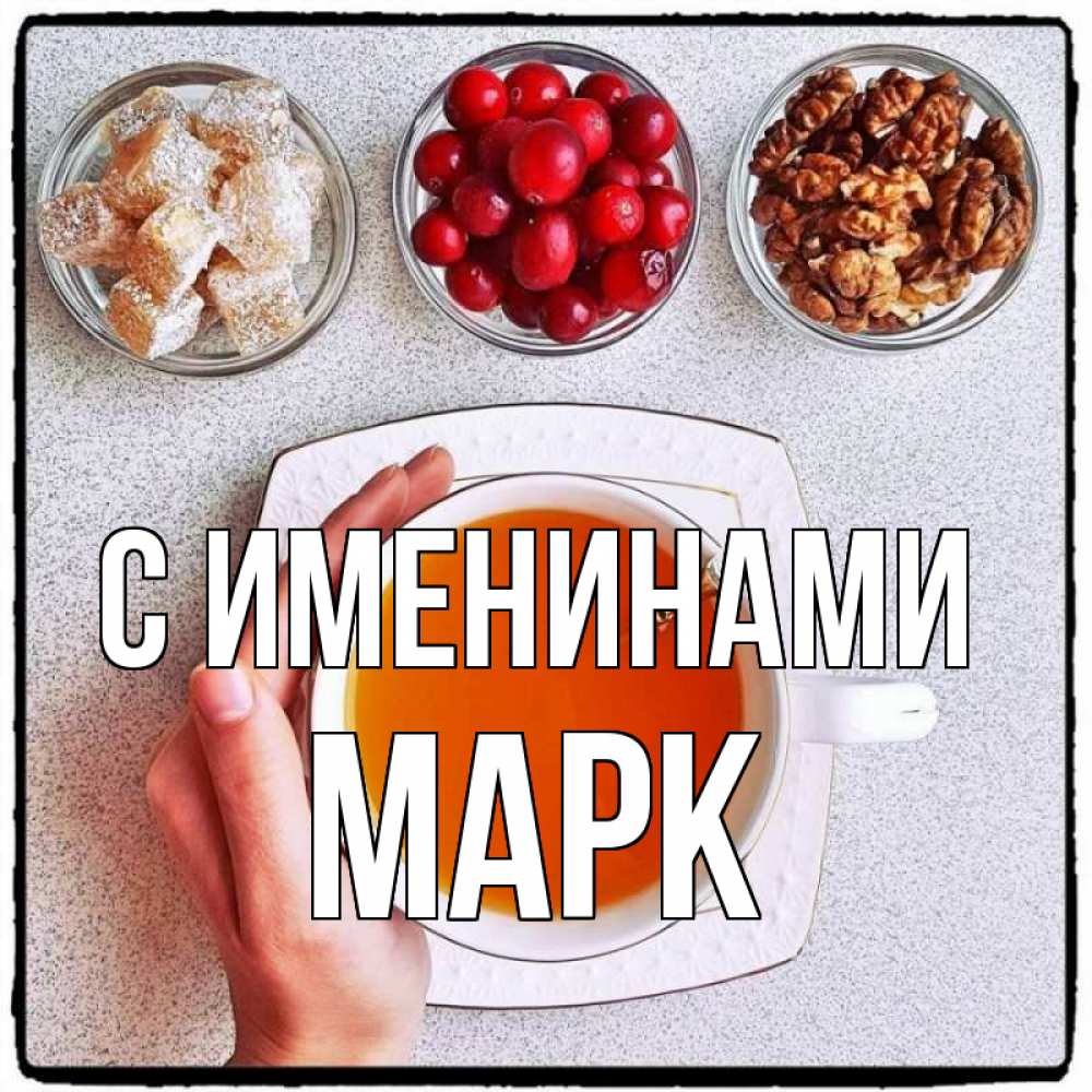 Открытка С именинами Марк. много полезных вкусняшек. на столе