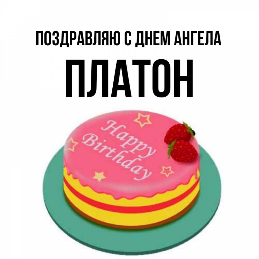 Открытка Поздравляю с днем Ангела Платон. торт на тарелке с клубникой и надписью с днем рождения. торт, клубника, днюха