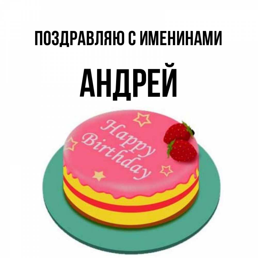 Открытка Поздравляю с именинами Андрей. торт на тарелке с клубникой и надписью с днем рождения. торт, клубника, днюха