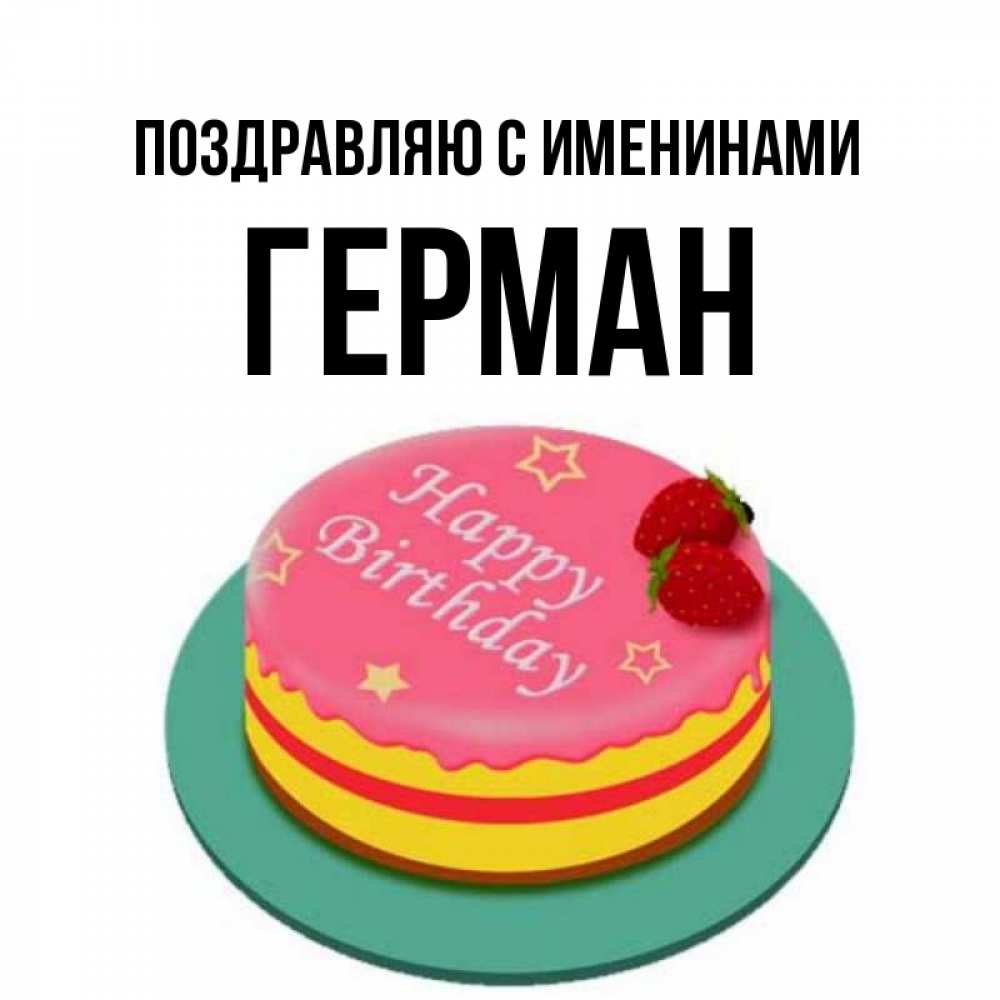 Открытка Поздравляю с именинами Герман. торт на тарелке с клубникой и надписью с днем рождения. торт, клубника, днюха