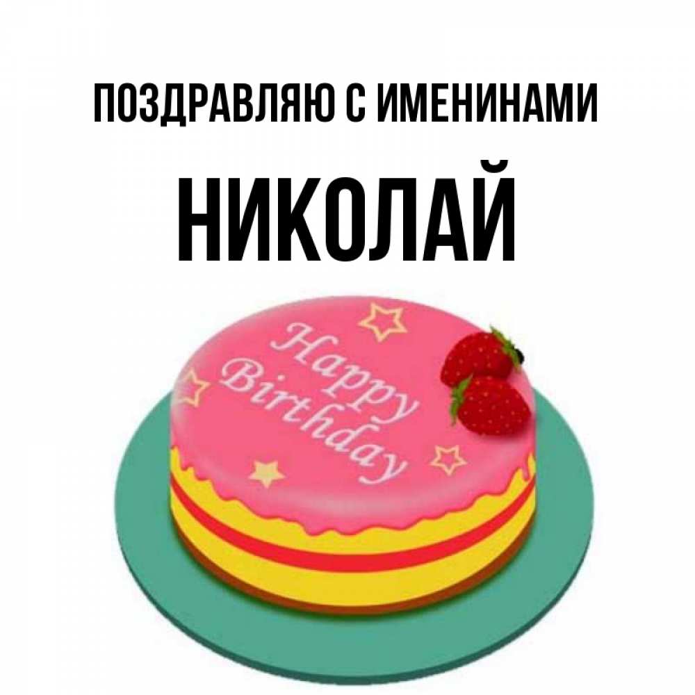 Открытка Поздравляю с именинами Николай. торт на тарелке с клубникой и надписью с днем рождения. торт, клубника, днюха