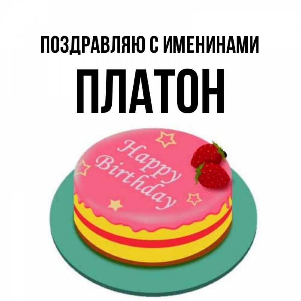 Открытка Поздравляю с именинами Платон. торт на тарелке с клубникой и надписью с днем рождения. торт, клубника, днюха