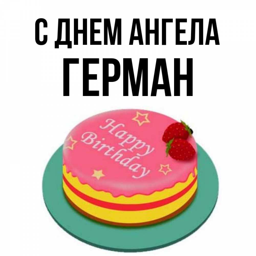 Открытка С днем Ангела Герман. торт на тарелке с клубникой и надписью с днем рождения. торт, клубника, днюха