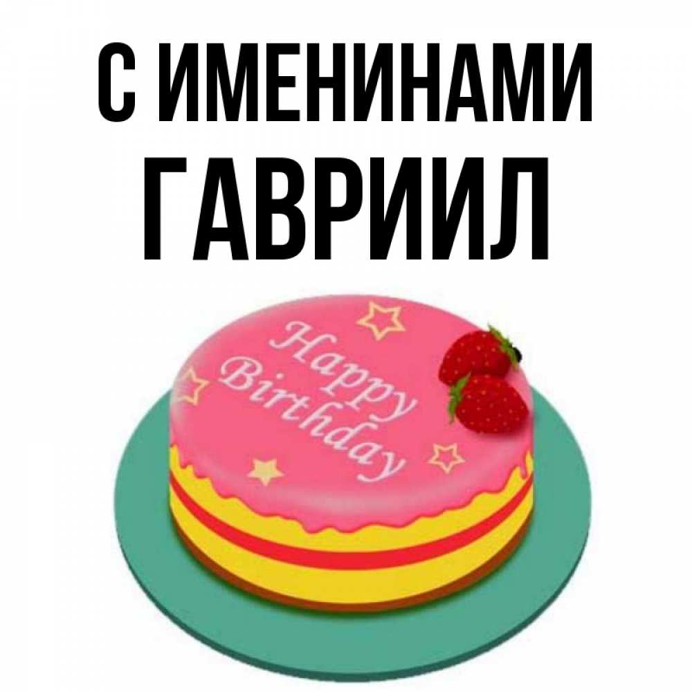 Открытка С именинами Гавриил. торт на тарелке с клубникой и надписью с днем рождения. торт, клубника, днюха
