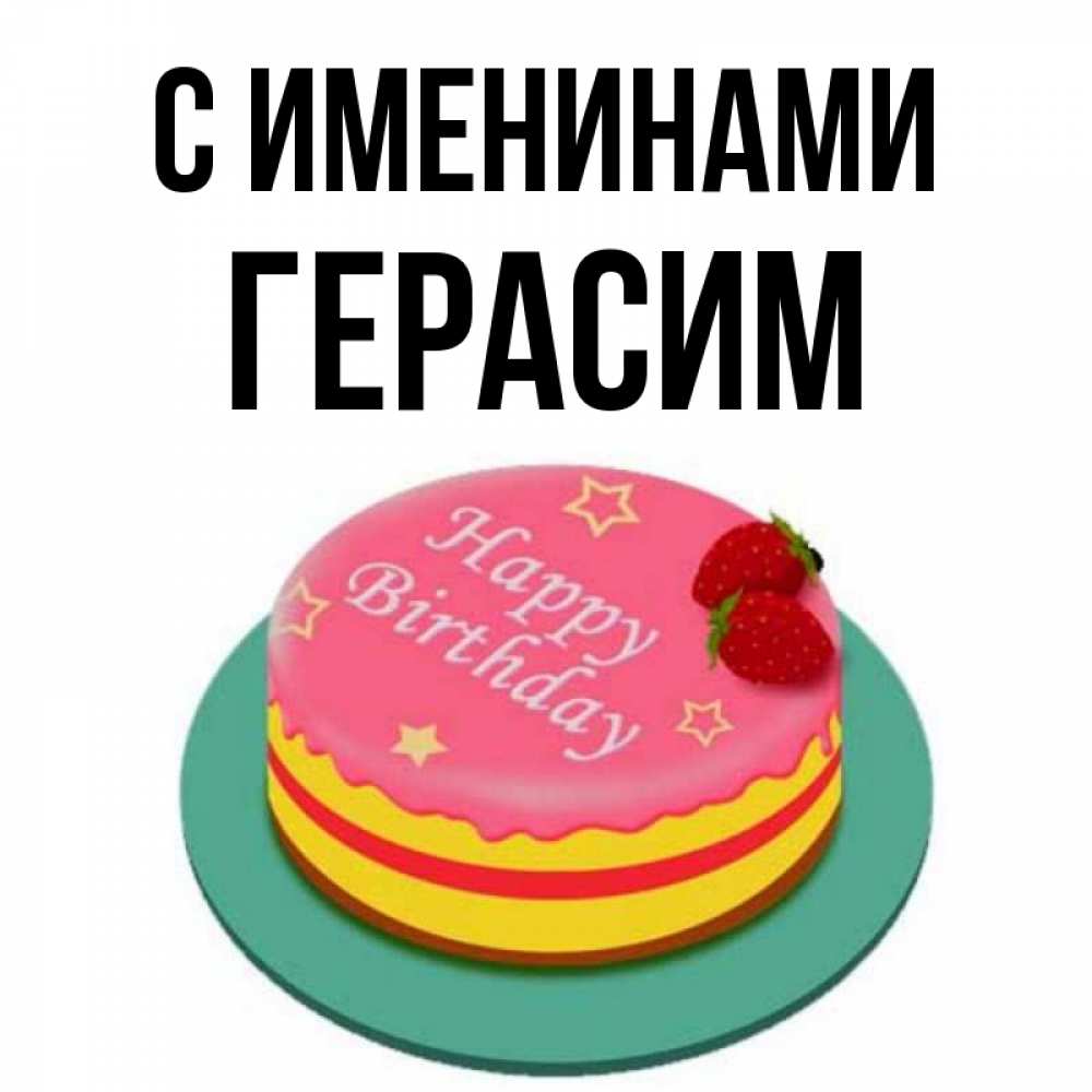 Открытка С именинами Герасим. торт на тарелке с клубникой и надписью с днем рождения. торт, клубника, днюха