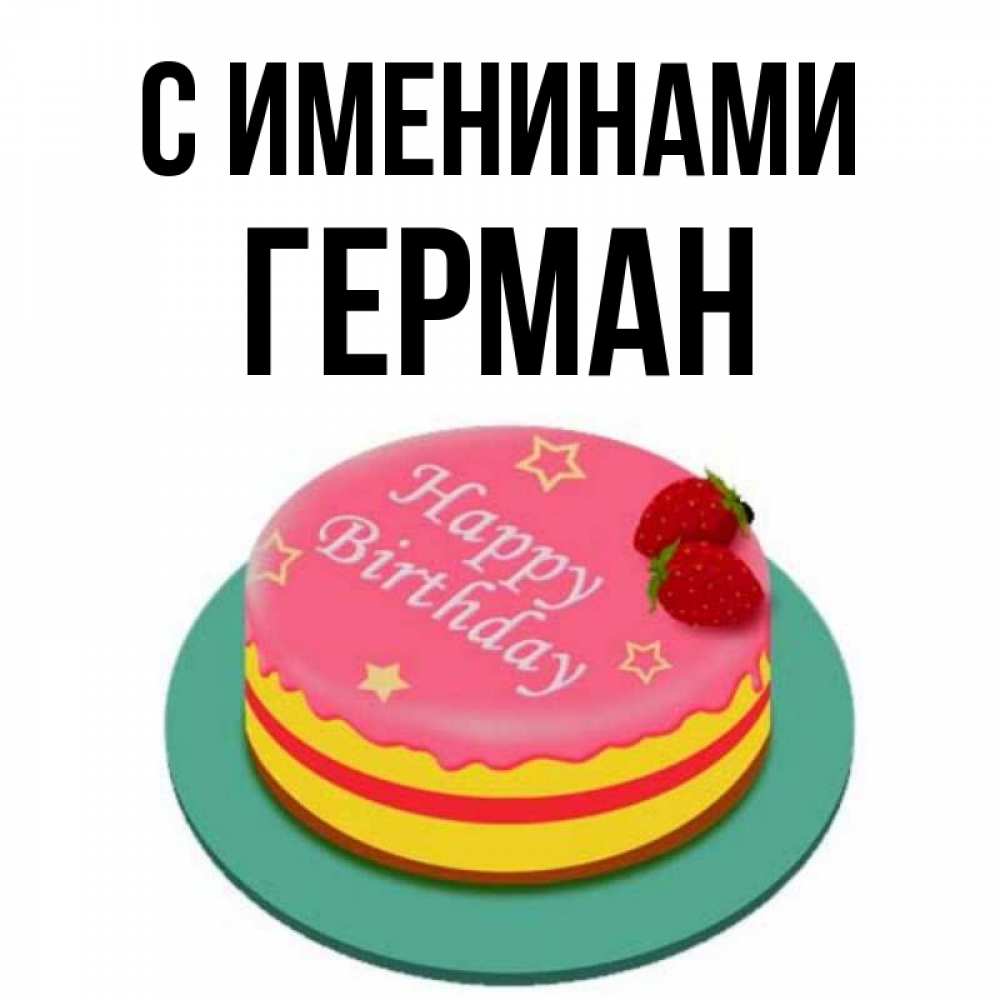 Открытка С именинами Герман. торт на тарелке с клубникой и надписью с днем рождения. торт, клубника, днюха