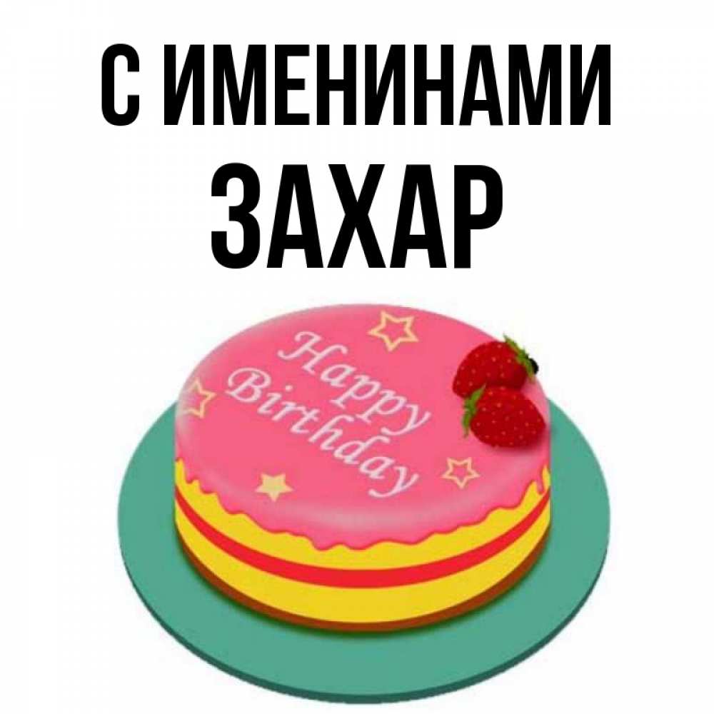Открытка С именинами Захар. торт на тарелке с клубникой и надписью с днем рождения. торт, клубника, днюха