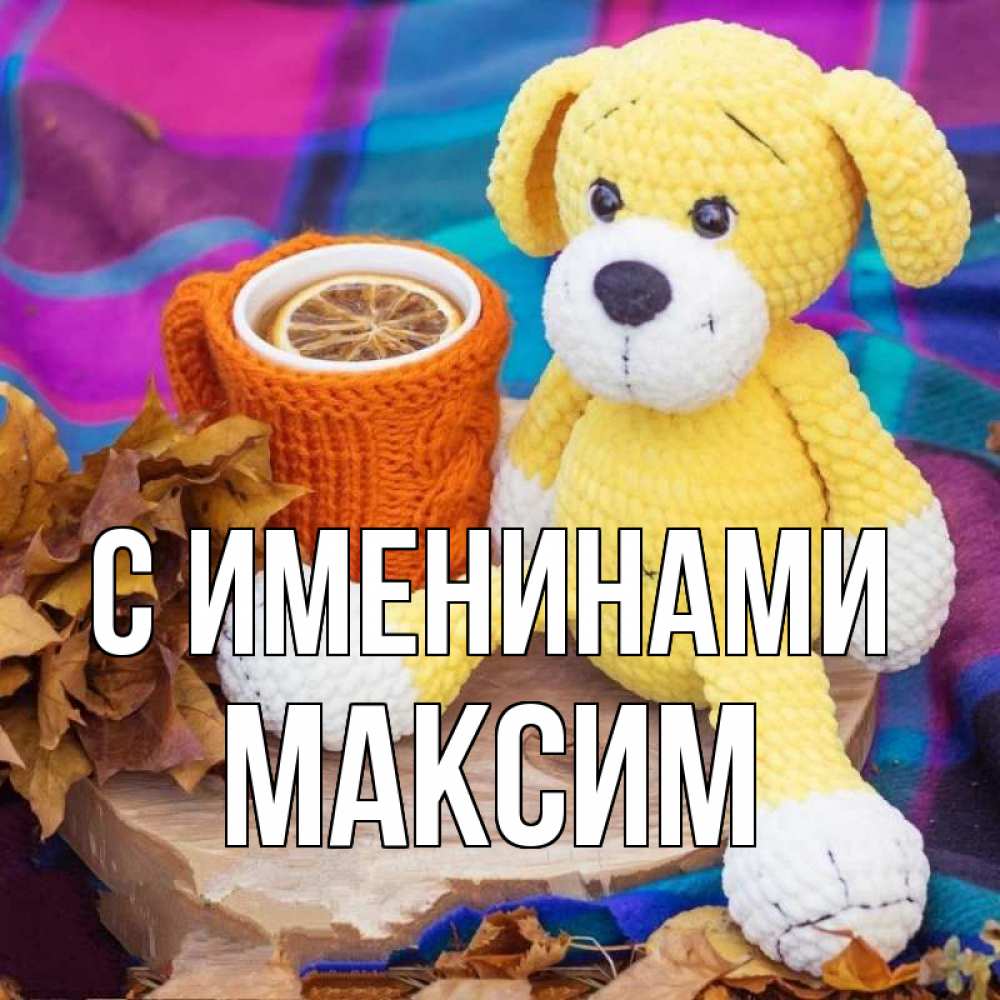 Открытка С именинами Максим. вязанный мишка и чехольчик вязанный на стакан. не болей и пей чай с лимоном