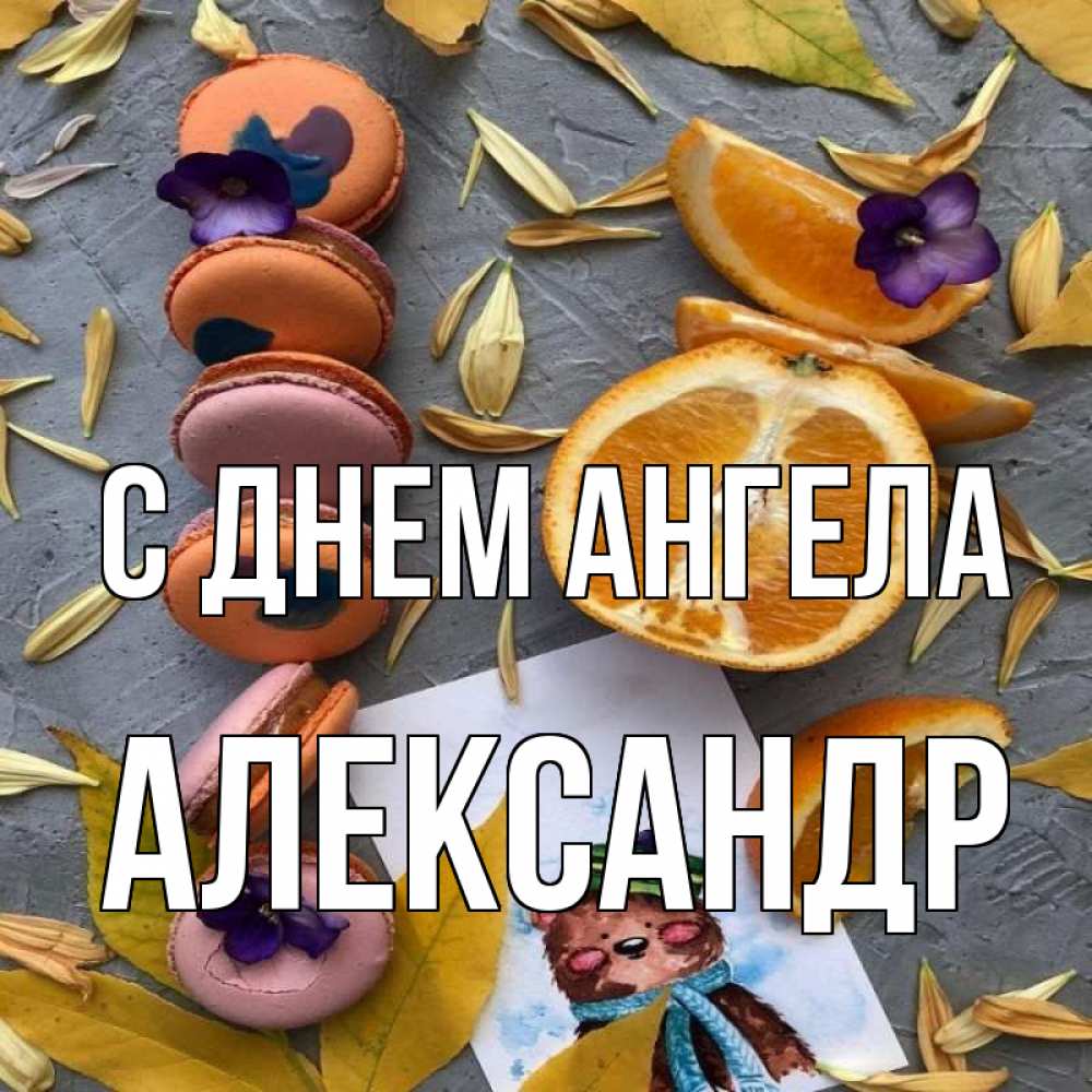 Открытка С днем Ангела Александр. печенюхи и апельсин. не болейте