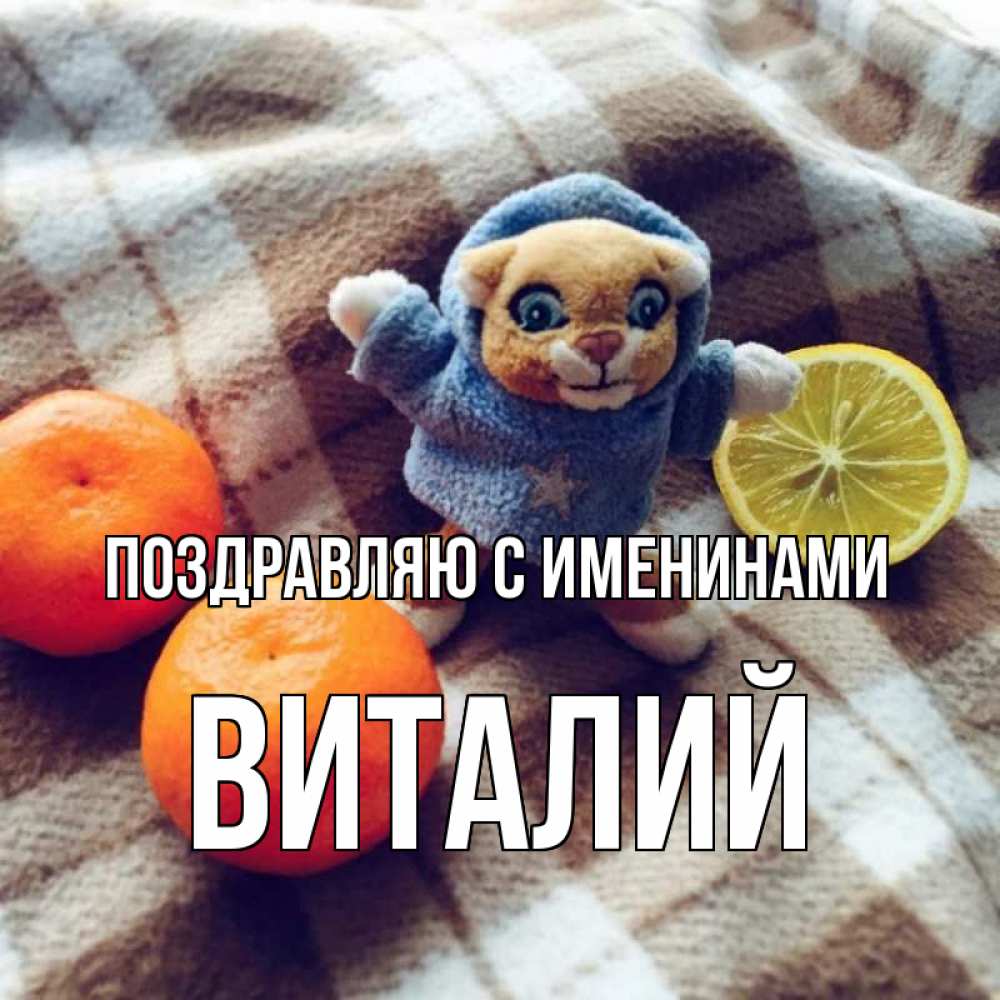 Открытка Поздравляю с именинами Виталий. тигра желает не болеть. вот тебе апельсинка и лимон