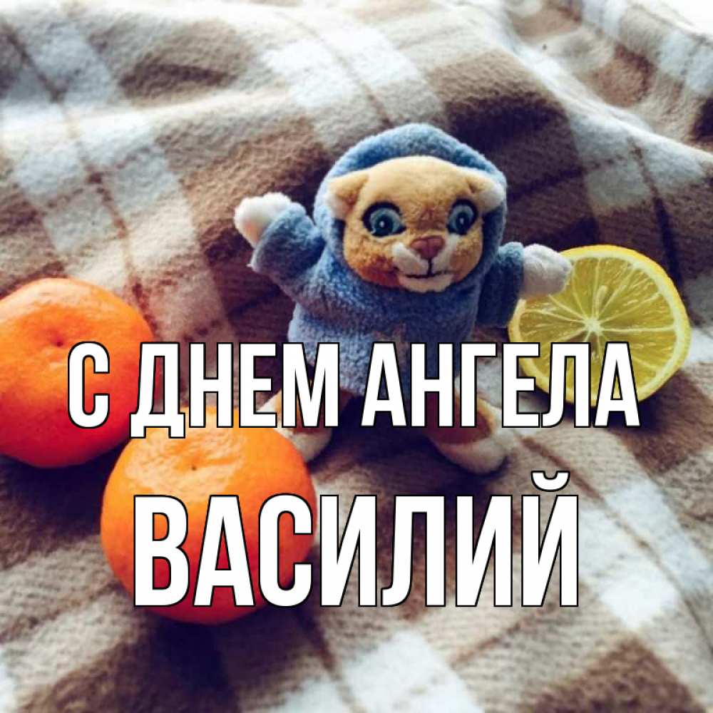 Открытка С днем Ангела Василий. тигра желает не болеть. вот тебе апельсинка и лимон