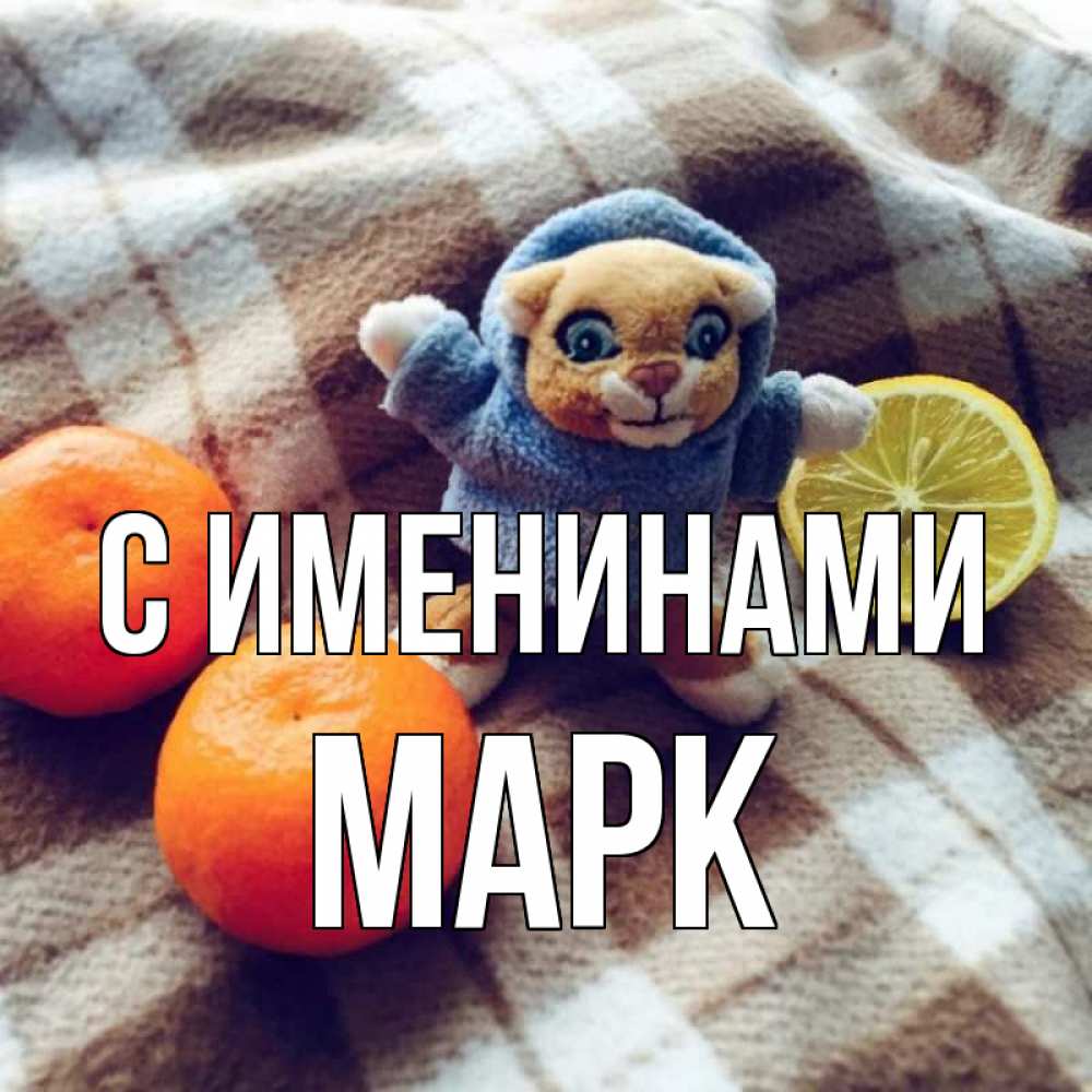 Открытка С именинами Марк. тигра желает не болеть. вот тебе апельсинка и лимон