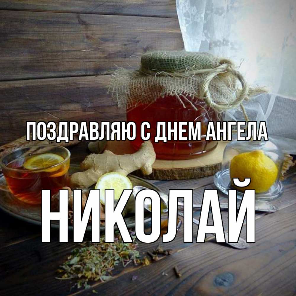 Открытка Поздравляю с днем Ангела Николай. мед и лимон от простуды. банка с медом