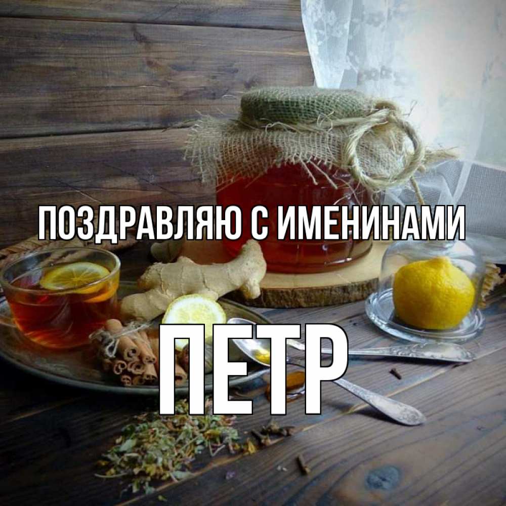 Открытка Поздравляю с именинами Петр. мед и лимон от простуды. банка с медом