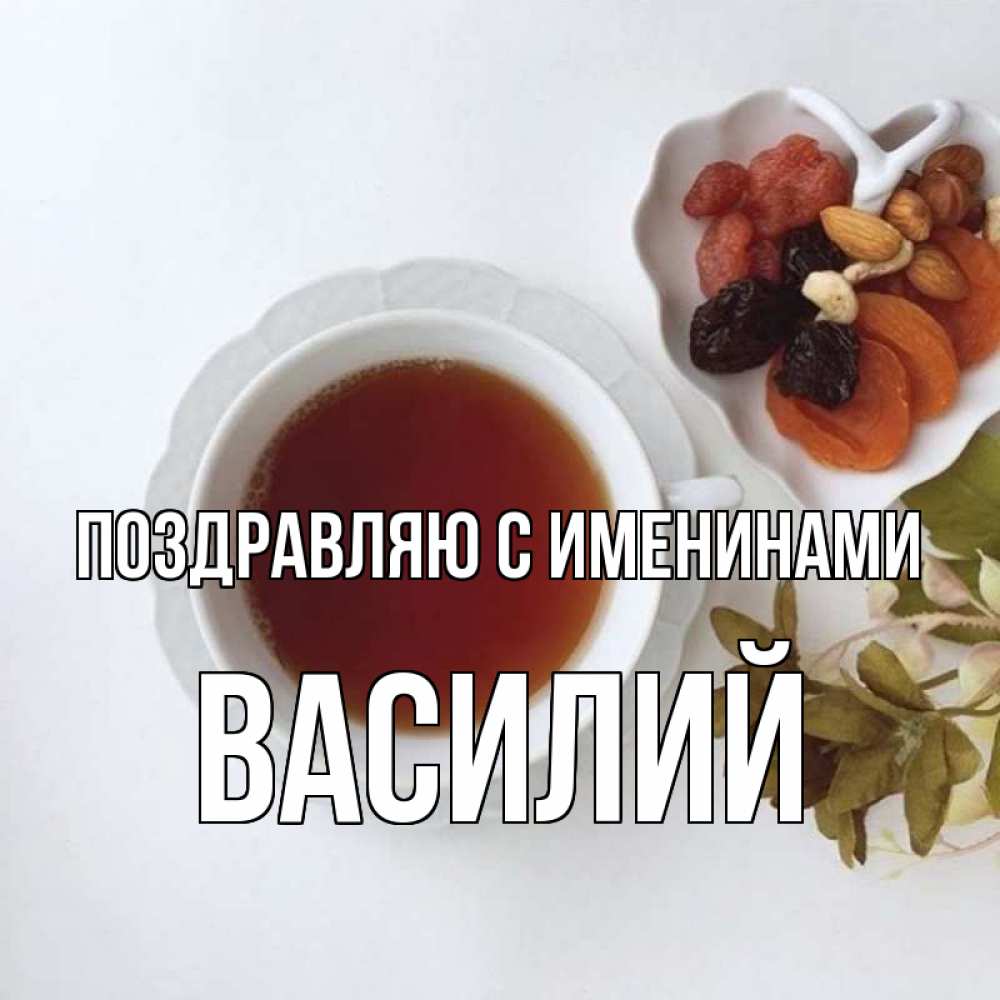 Открытка Поздравляю с именинами Василий. чай и сухофрукты. неизвестные растения