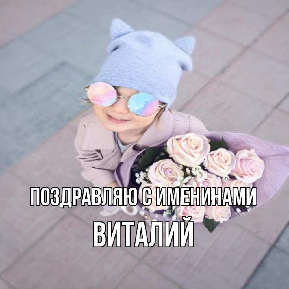Открытка Поздравляю с именинами Виталий. девочка в очках. букет роз и ребенок