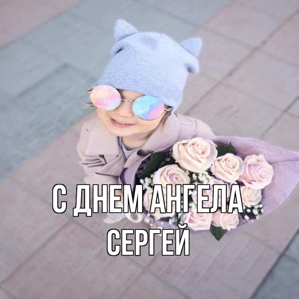 Открытка С днем Ангела Сергей. девочка в очках. букет роз и ребенок