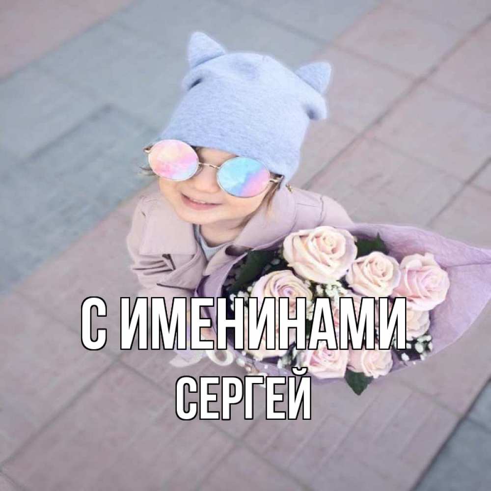 Открытка С именинами Сергей. девочка в очках. букет роз и ребенок