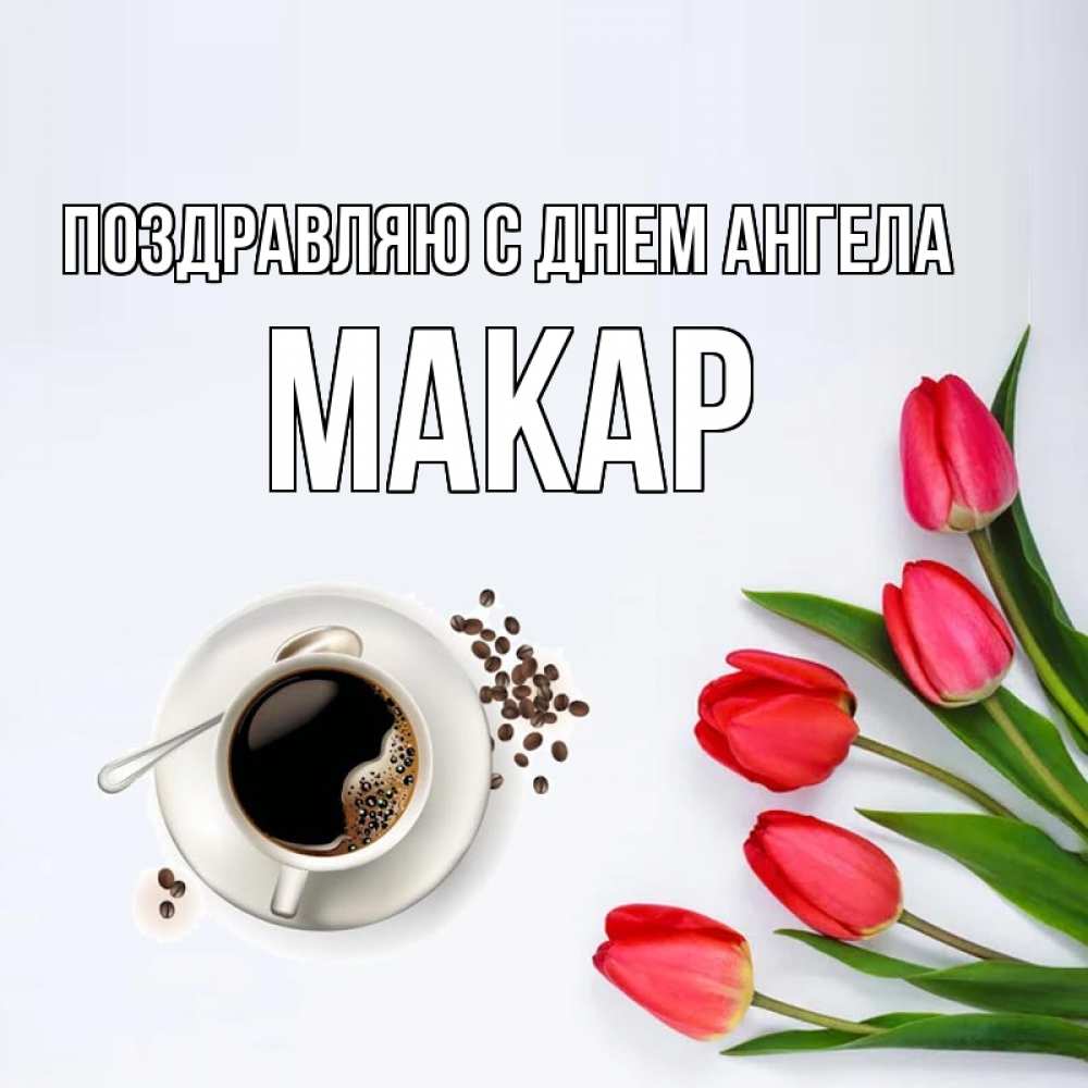 Открытка Поздравляю с днем Ангела Макар. тюльпаны и кофе. красное блюдце