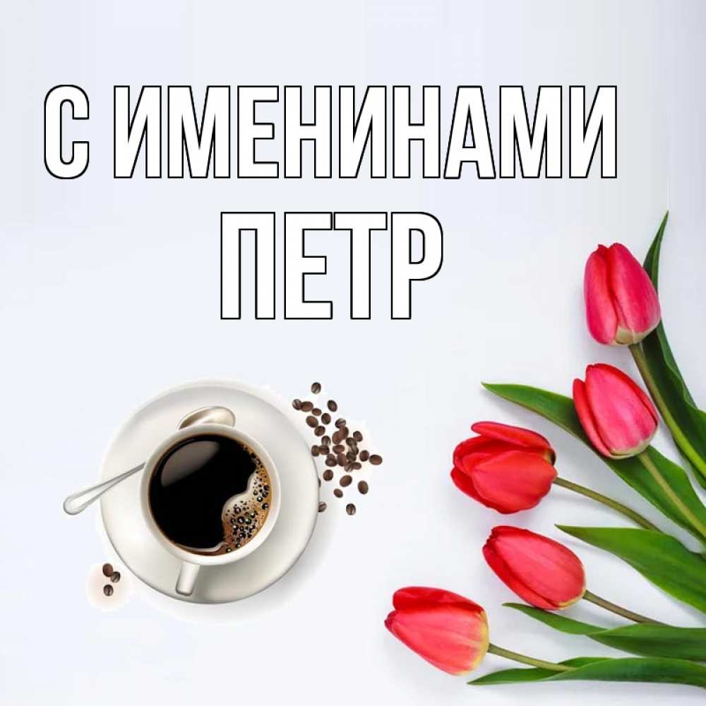 Открытка С именинами Петр. тюльпаны и кофе. красное блюдце