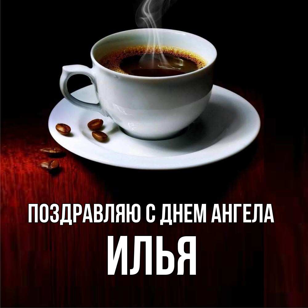 Открытка Поздравляю с днем Ангела Илья. кофе и зерна. белая посуда