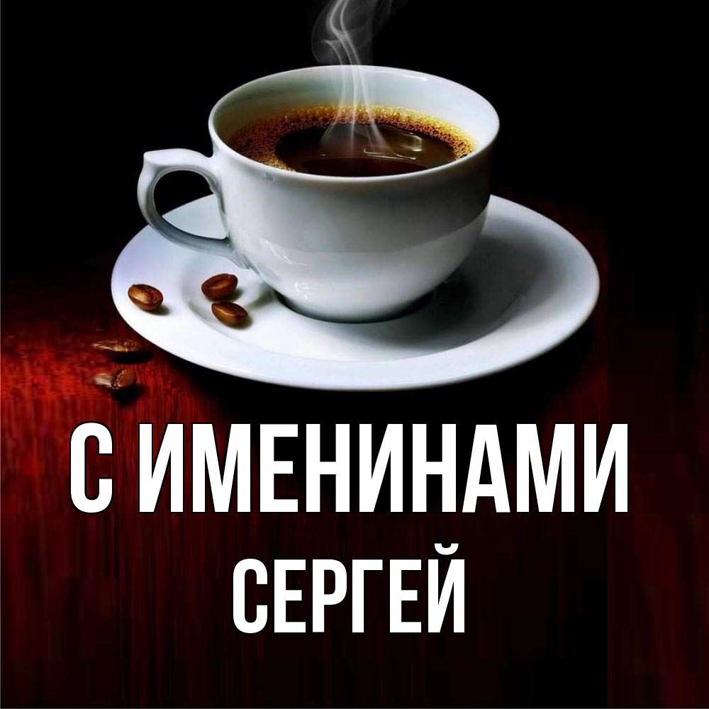 Открытка С именинами Сергей. кофе и зерна. белая посуда
