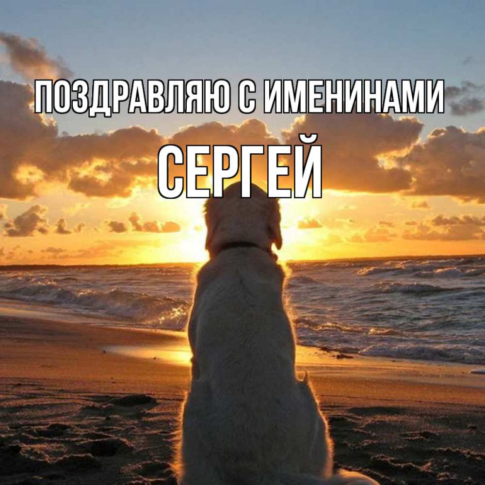 Открытка Поздравляю с именинами Сергей. собака на берегу моря. восход солнца
