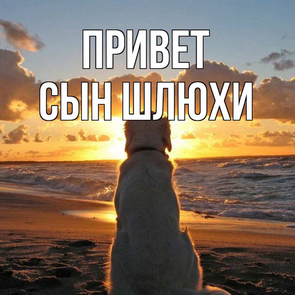 Открытка Привет Сын шлюхи. собака на берегу моря. восход солнца