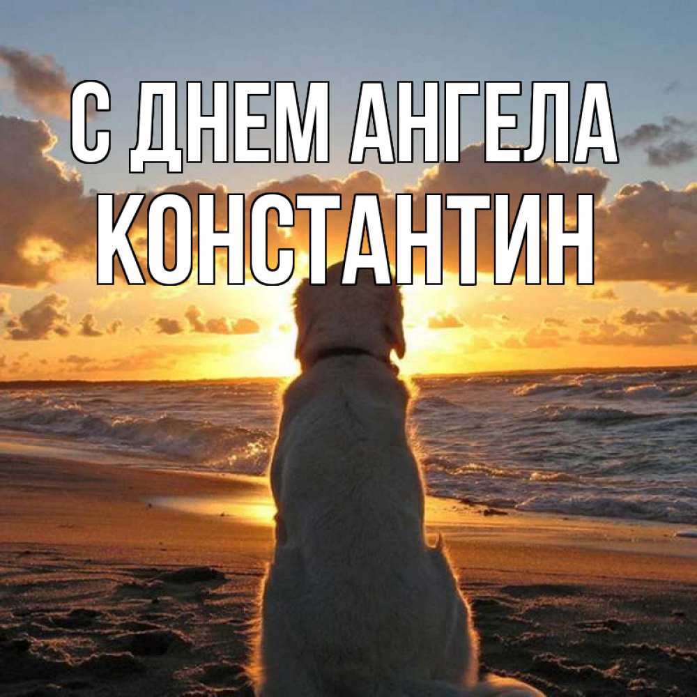 Открытка С днем Ангела Константин. собака на берегу моря. восход солнца
