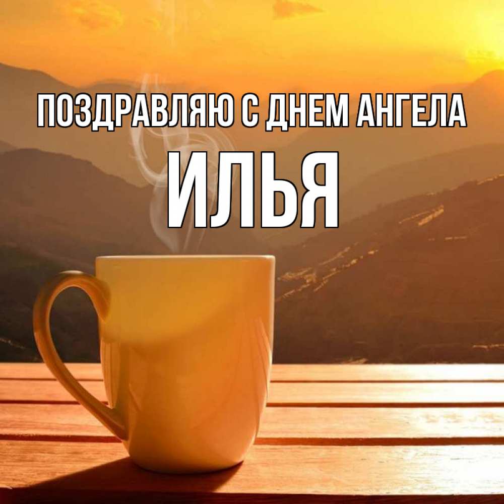 Открытка Поздравляю с днем Ангела Илья. желтая кружка и пар. кофе в горах