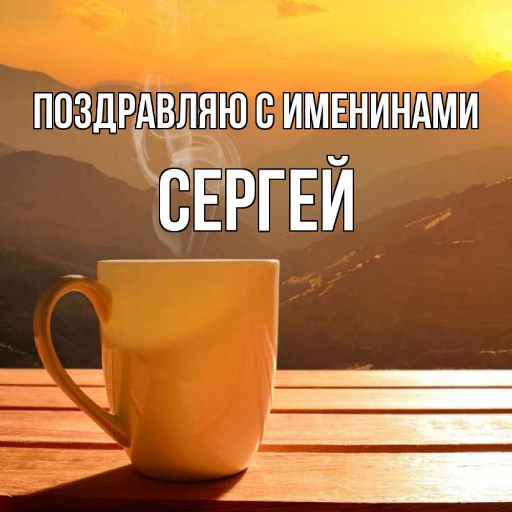 Открытка Поздравляю с именинами Сергей. желтая кружка и пар. кофе в горах