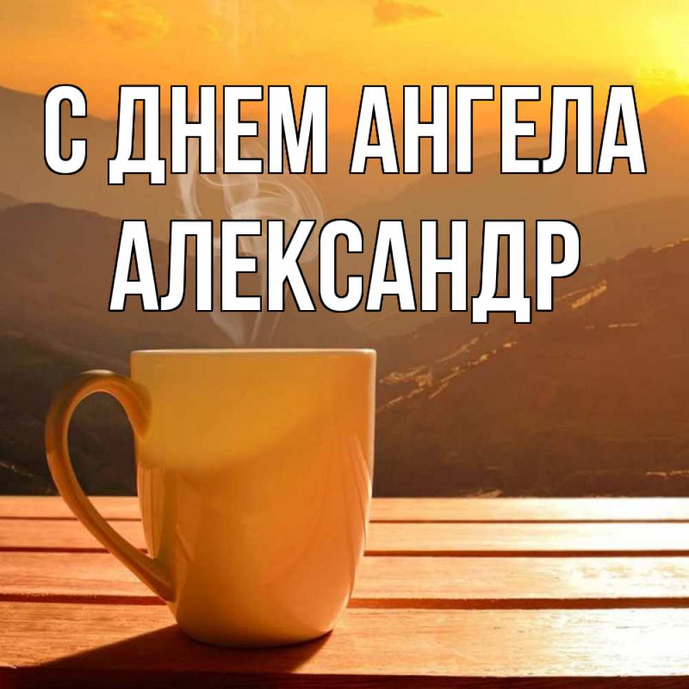 Открытка С днем Ангела Александр. желтая кружка и пар. кофе в горах