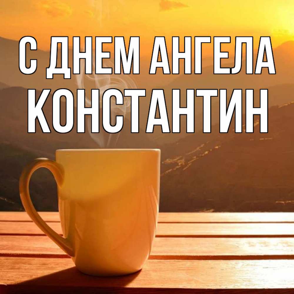 Открытка С днем Ангела Константин. желтая кружка и пар. кофе в горах