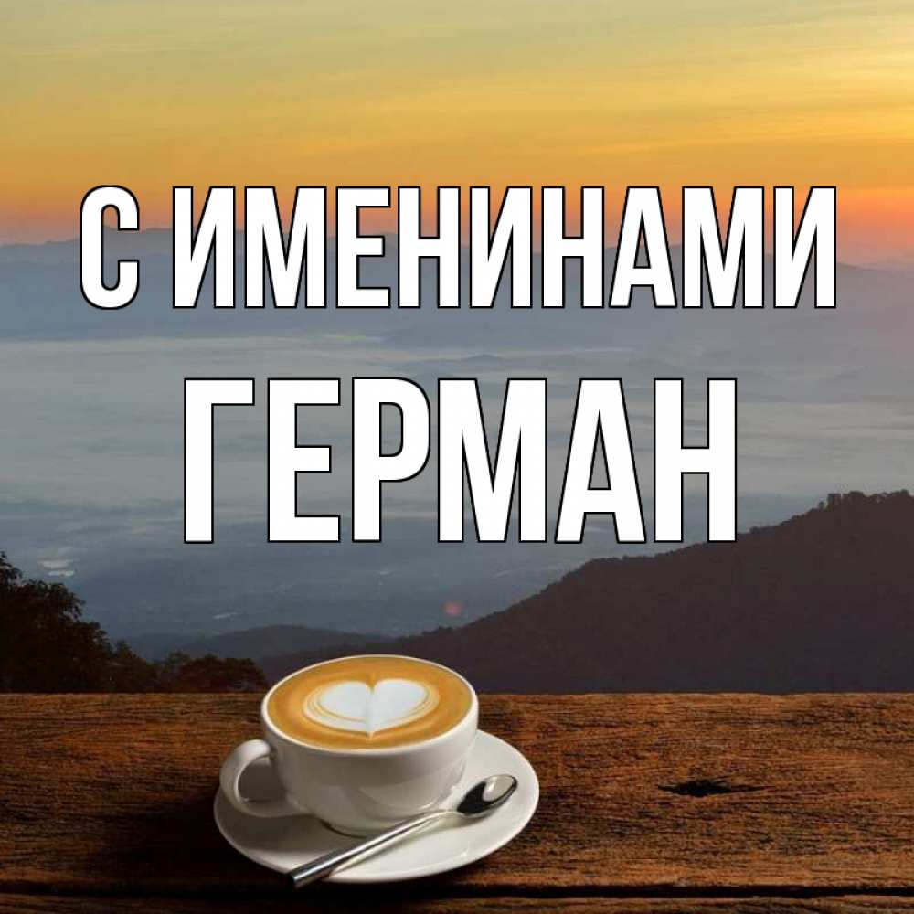 Открытка С именинами Герман. горный пейзаж. кофе на высоте