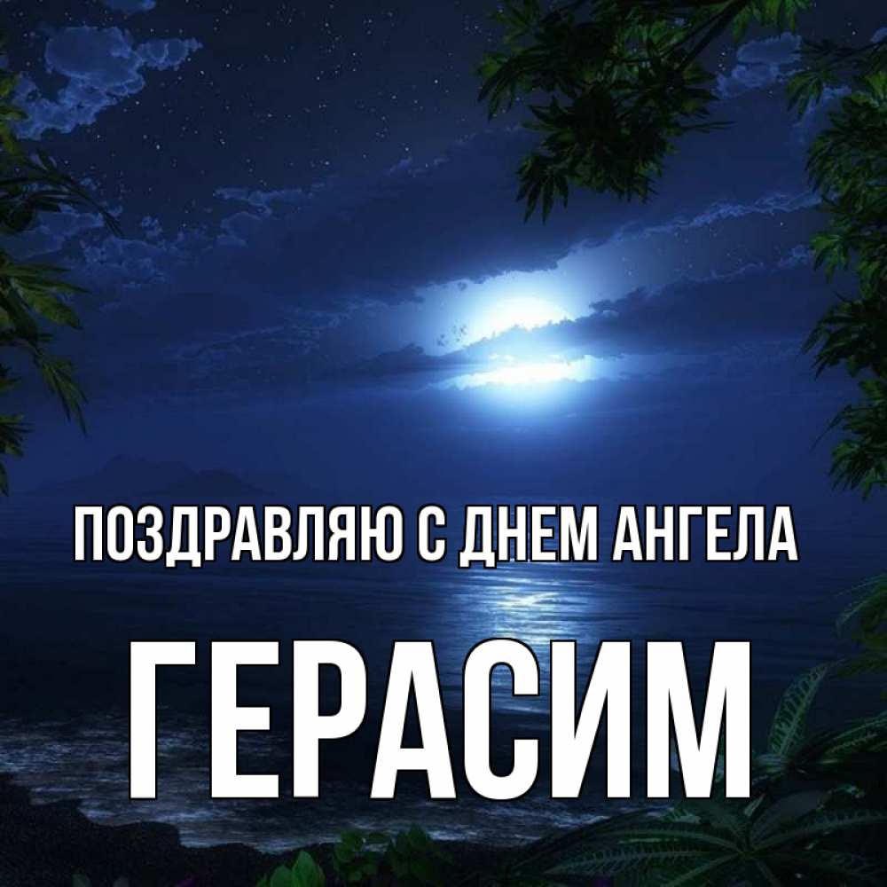 Открытка Поздравляю с днем Ангела Герасим. луна сквозь облака. тропический остров