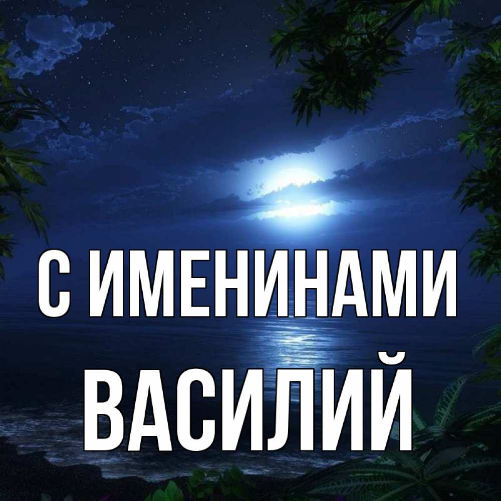 Открытка С именинами Василий. луна сквозь облака. тропический остров