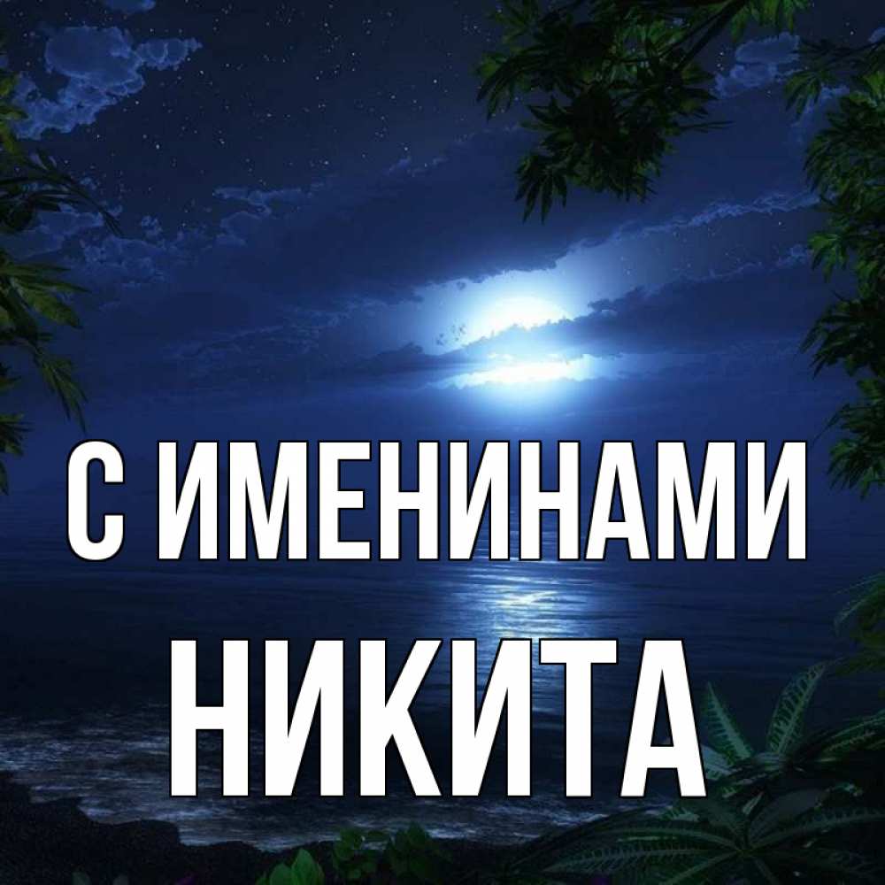 Открытка С именинами Никита. луна сквозь облака. тропический остров