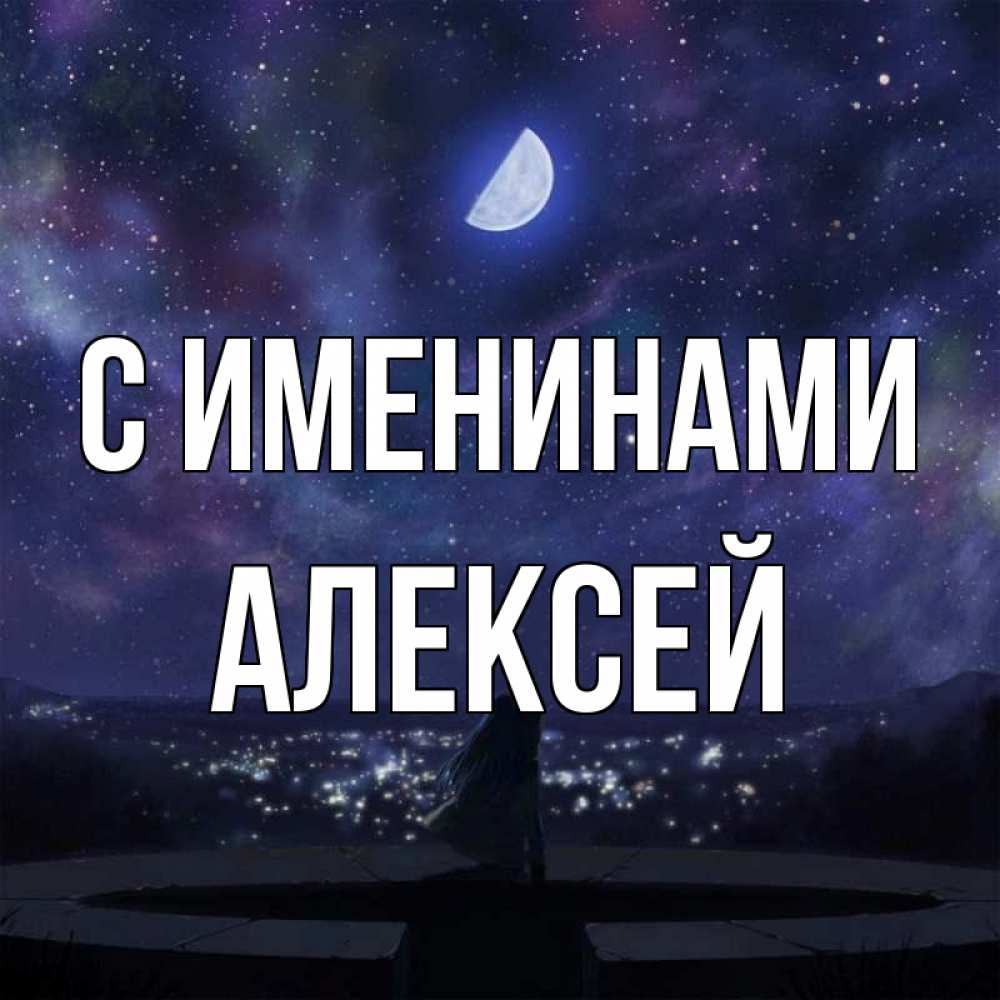 Открытка С именинами Алексей. Звездное небо отражается в море. набережная