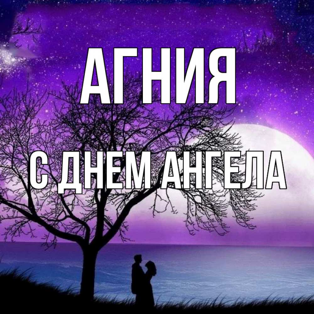 Открытка Агния С днем ангела. Дерево и вода. огромная луна и парочка