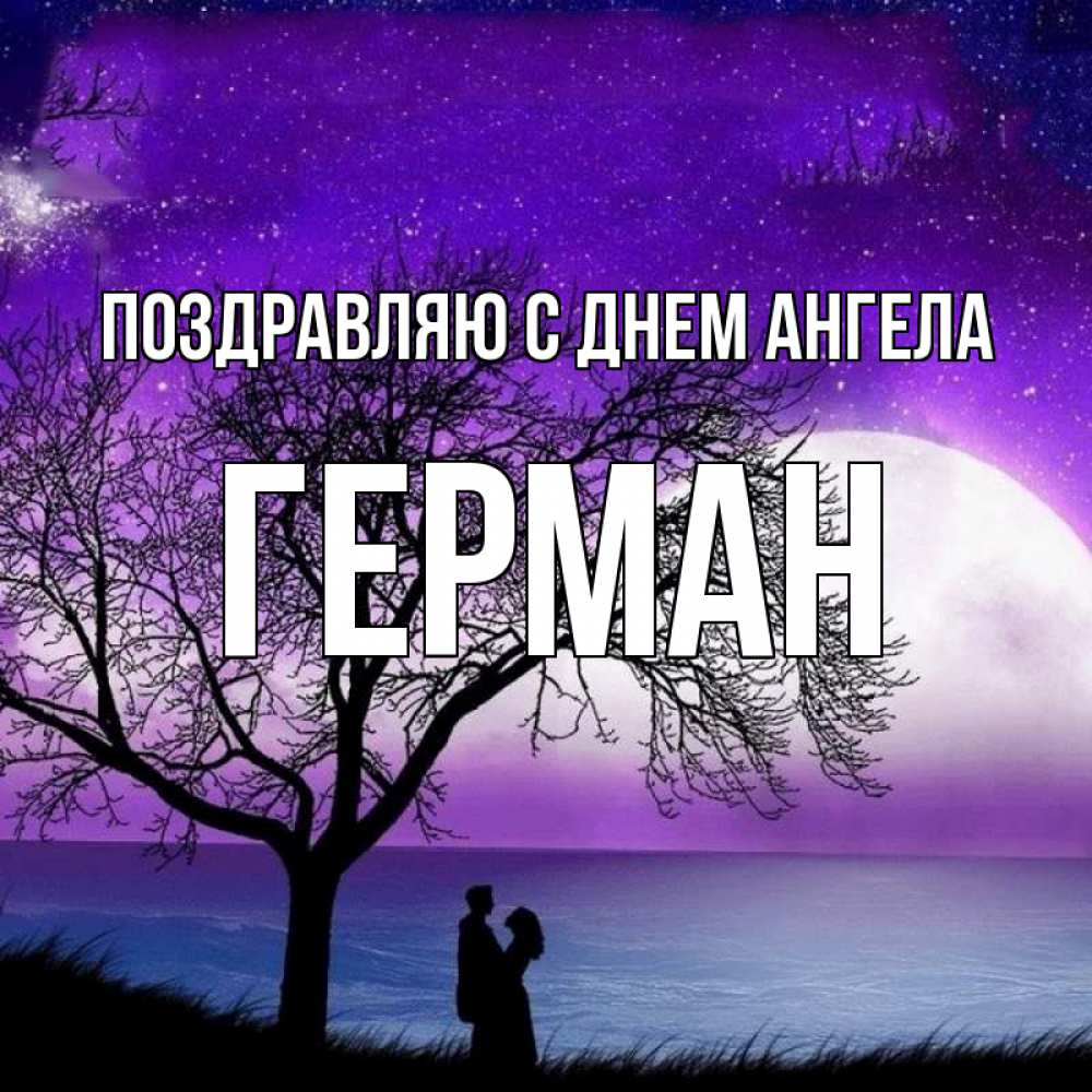 Открытка Поздравляю с днем Ангела Герман. Дерево и вода. огромная луна и парочка