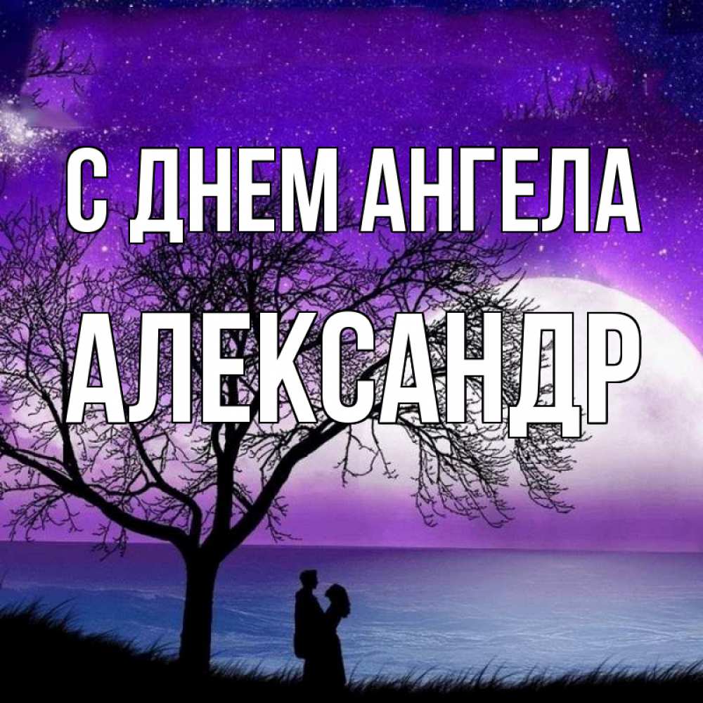 Открытка С днем Ангела Александр. Дерево и вода. огромная луна и парочка