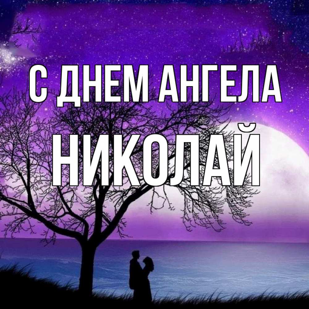 Открытка С днем Ангела Николай. Дерево и вода. огромная луна и парочка