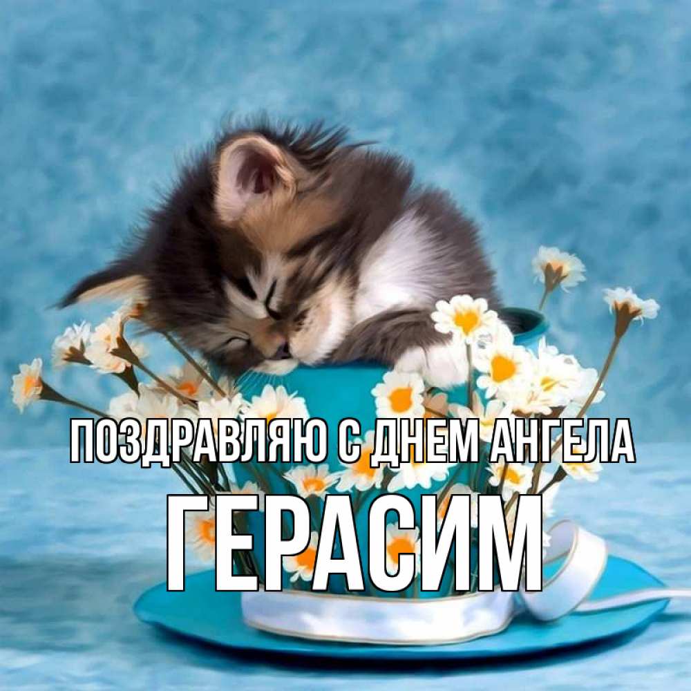 Открытка Поздравляю с днем Ангела Герасим. котик в кружке с цветами. котенок спит в кружке с блюдцем