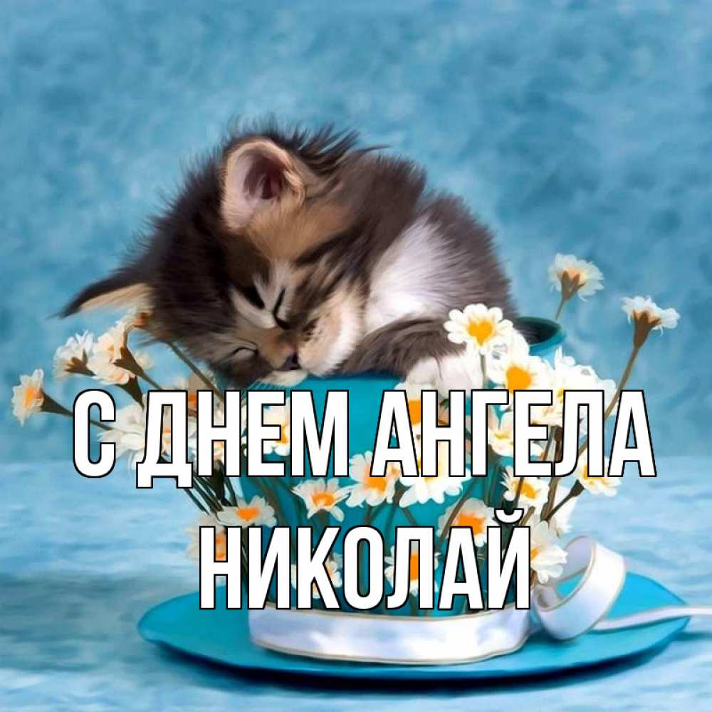 Открытка С днем Ангела Николай. котик в кружке с цветами. котенок спит в кружке с блюдцем