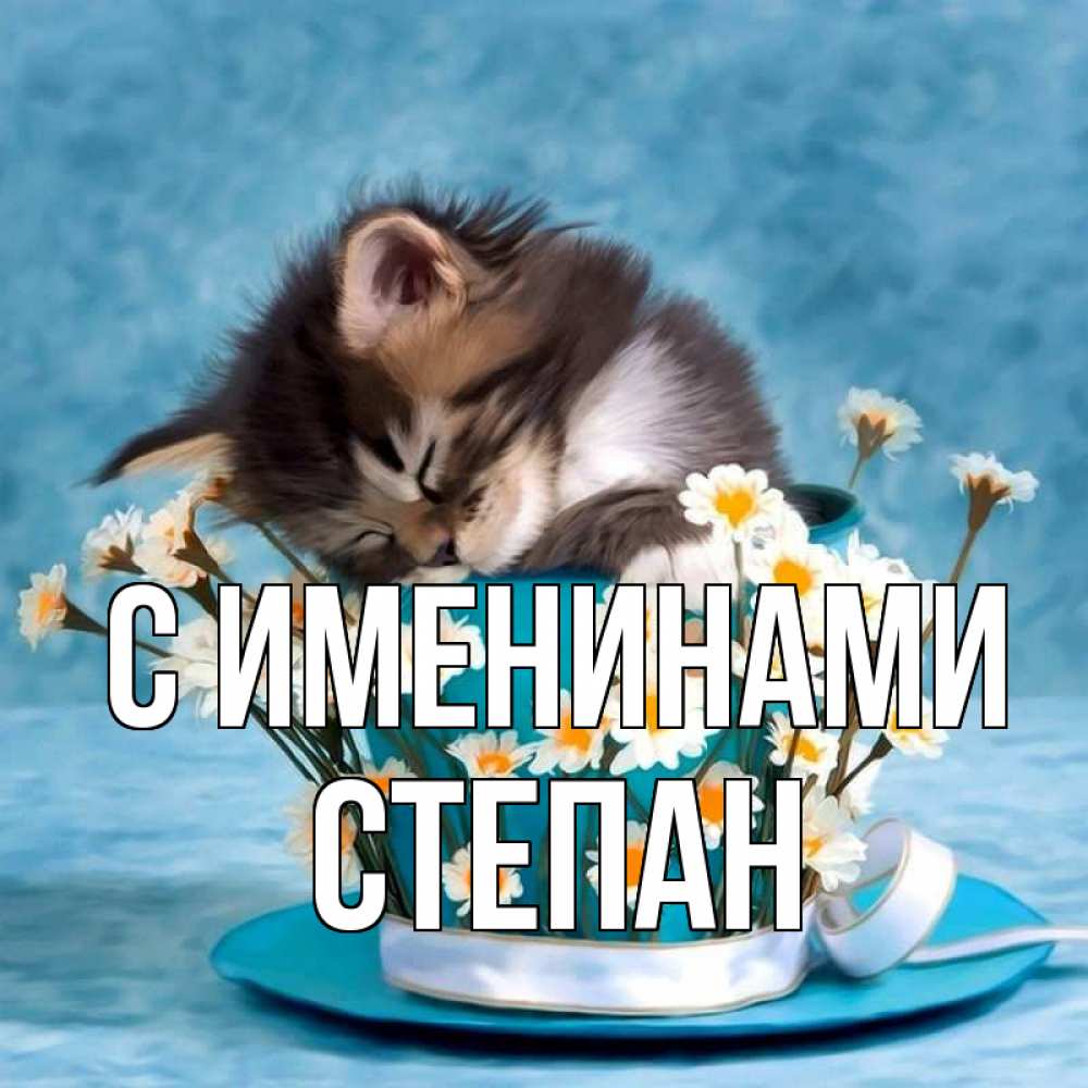 Открытка С именинами Степан. котик в кружке с цветами. котенок спит в кружке с блюдцем