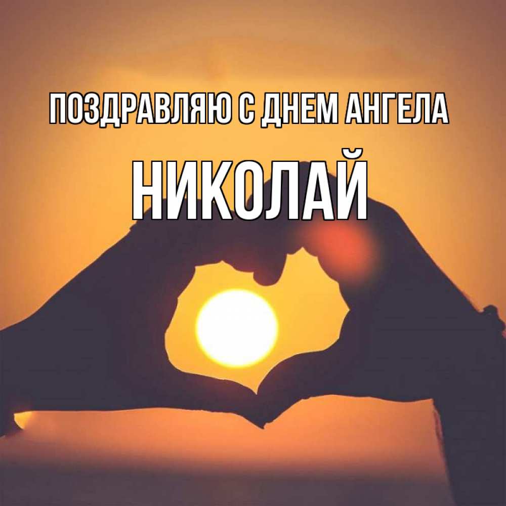 Открытка Поздравляю с днем Ангела Николай. солнце в руках. садится солнце